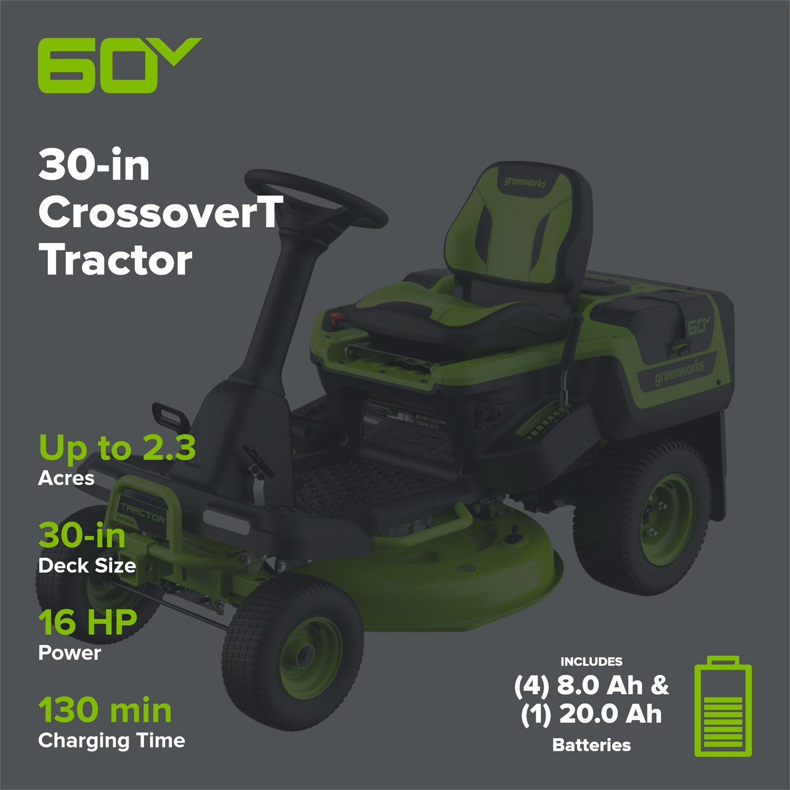60V 30” CrossoverT Riding Lawn Tractor with (2) 8.0 Ah, (2) 4.0 Ah Batteries & 600-Watt Charger