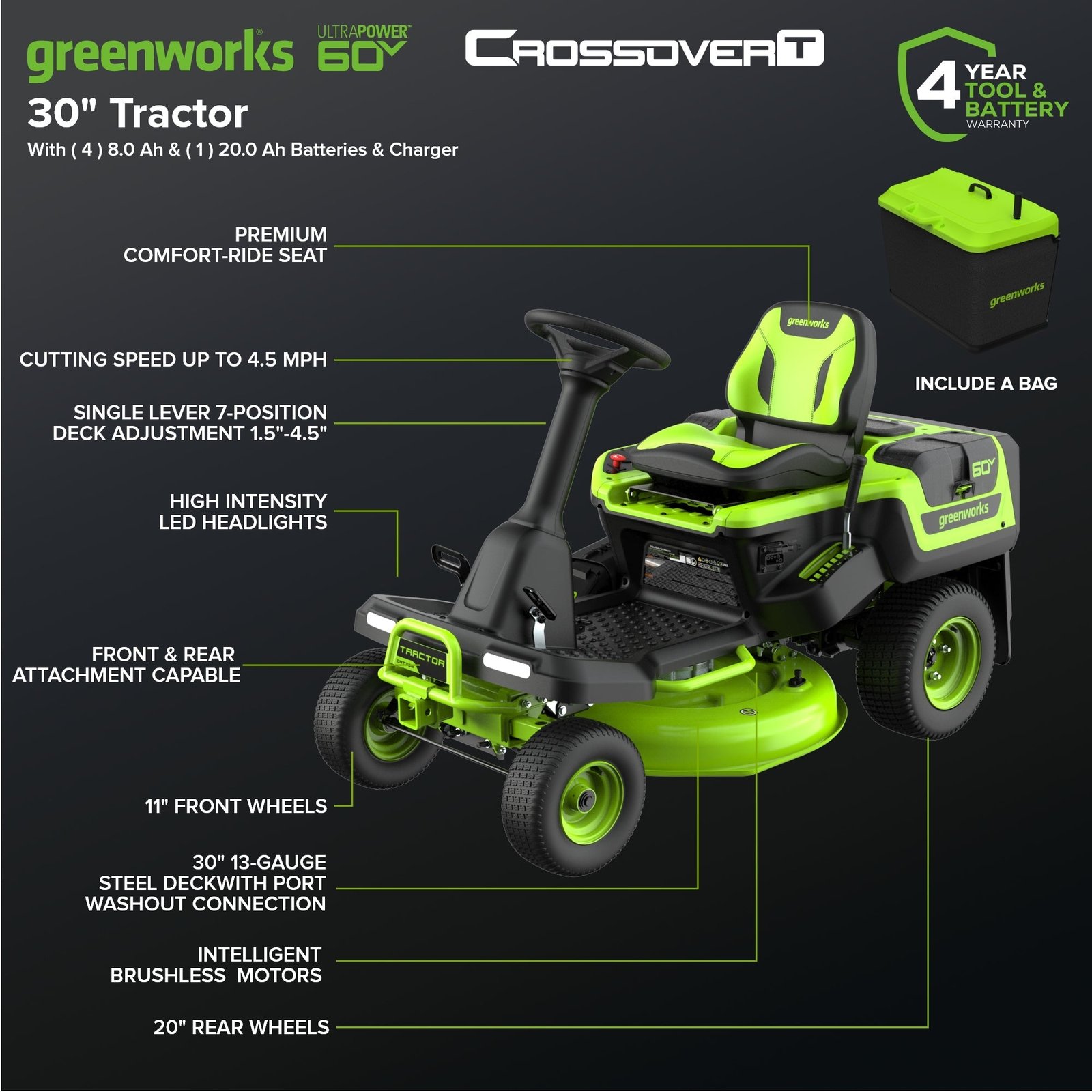 60V 30″ CrossoverT Riding Lawn Tractor, Bagger Included, (4) 8.0 Ah (1) 20.0Ah Batteries and 600-Watt Charger