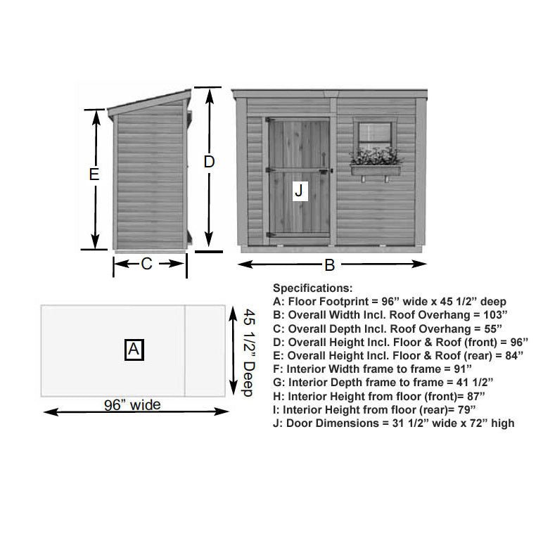 Featuring a high front roof that slopes to the rear, this 8′ x 4′ single door storage shed is constructed from Western red cedar for long-lasting strength. The 8 x 4 storage shed will help keep your tools, supplies and other items organized, out of the way, and protected from the elements.