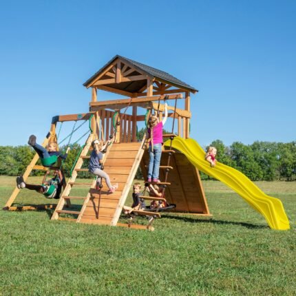 Create an exciting outdoor play space with the Backyard Discovery Atlantis Swing Set, perfect for families who want big adventures in smaller spaces. The Atlantis is designed with an upper clubhouse complete with a wood roof, bay windows, and a balcony to encourage imaginative play and exciting adventures. Below, a versatile space transforms from a cozy hideout to a sand pit, featuring a snack shelf, so kids can refuel during play time. Little explorers can choose their path to the elevated clubhouse with either the wide step ladder providing easy accessibility or the daring rock wall for a more challenging climb. The thrilling 8-foot speedy wave slide provides swift, safe rides back to the ground, complemented by two belt swings and a trapeze bar for shared playground fun. This thoughtfully designed wooden swing set proves that compact spaces can still offer endless play possibilities. Crafted from naturally durable cedar wood, it comes ready to assemble with guided instructions through the interactive BILT® app for easier installation. The Atlantis Wood Swing Set brings everything families love about larger playsets in a size that fits perfectly in smaller backyards, creating a beloved play space that will last for years of outdoor adventures.