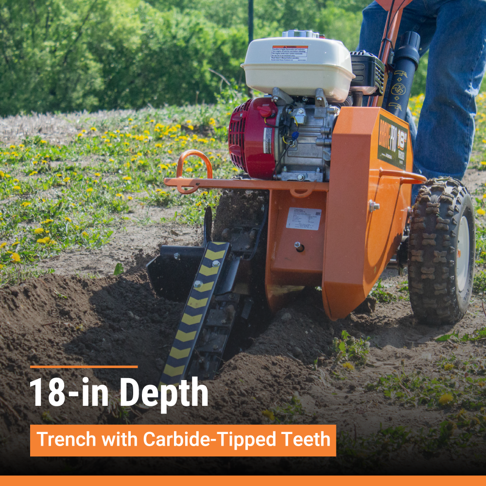 - Carbide-tipped shark teeth on the chain to easily dig a 3-in. W trench up to depths of 18 in.