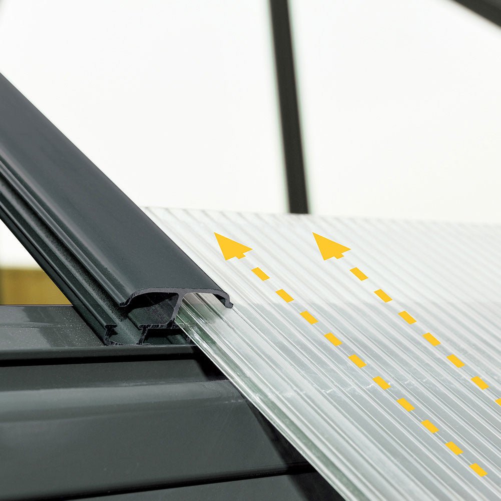 This beautifully designed greenhouse features a heavy-duty aluminum frame with a galvanized steel base. SnapGlas polycarbonate panels are virtually unbreakable, and 100% UV protected. Panels easily slide into the frame and lock in place without any complicated hardware or tools. It even comes designed with an integrated gutter system, so you can use the roof to collect rainwater.