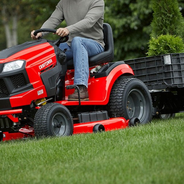 Craftsman T310 lawn mower with Turn Tight steering is capable of navigating the most intricate lawns with precision and agility, without sacrificing power and comfort. With Tight Turn steering, your turning radius is a fraction of your neighbors at 5-in, saving you time and trimming as you maneuver around trees, boarders and fences quickly and effortlessly. Powered by a 24 HP Kohler twin-cylinder 7000 series engine and featuring a 54-in steel deck, this lawn mower stays smooth and efficient, no matter what you throw at it. The hydrostatic transmission with foot pedal control and high-back seating will provide you with smooth transitions, support and comfort. Add the optional mulching kit and bagger to finish your lawn like a professional. This riding mower includes a front-end bumper for added protection and comes with a two-year warranty.