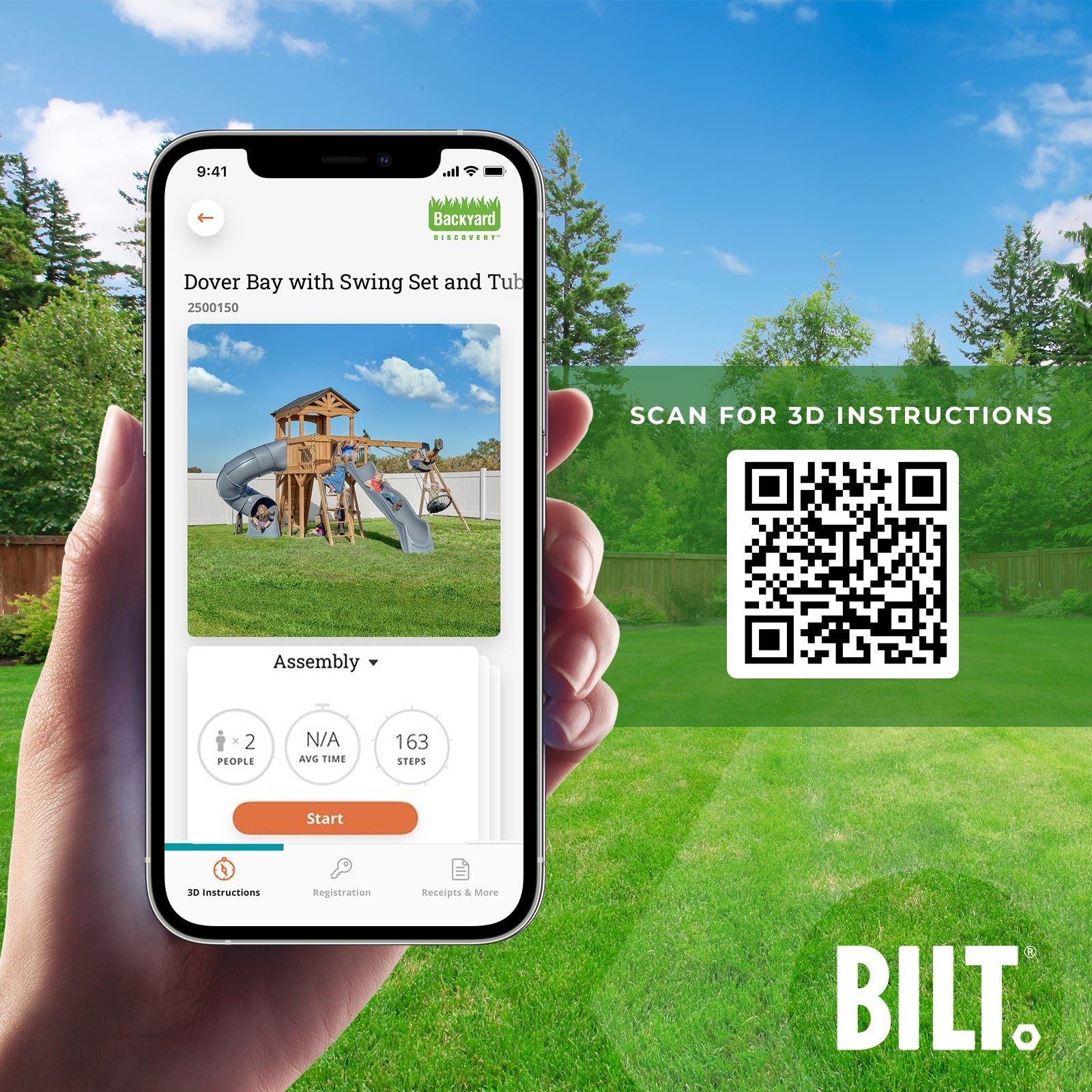 The Dover Bay Swing Set turns your backyard into the ultimate adventure zone. Built from premium Nordic spruce and finished in a light brown stain, this outdoor playset combines heavy-duty strength with lasting style. The elevated clubhouse gives kids a shaded hangout with wide windows, a wood roof, and plenty of room to explore. Complete with a chalkboard for drawing artwork, a steering wheel for imaginary voyages, and a toy telescope for spotting distant lands, the clubhouse is the perfect launch pad for every adventure. Kids can reach the top by climbing the wide step ladder or challenging themselves on the rock wall with colorful grips that help build coordination and confidence. Two classic belt swings offer endless sky high adventure, while the web swing lets kids soar. The enclosed tube slide lets them launch into a twisting adventure before popping out below, while the 10-foot wave slide creates a speedy ride to the bottom. The ready-to-assemble design comes with guided BILT® app instructions for an easier setup. Durably designed, this outdoor swing set is built to handle weather and years of active outdoor play. Create a backyard full of memories with the Dover Bay Swing Set by Backyard Discovery.