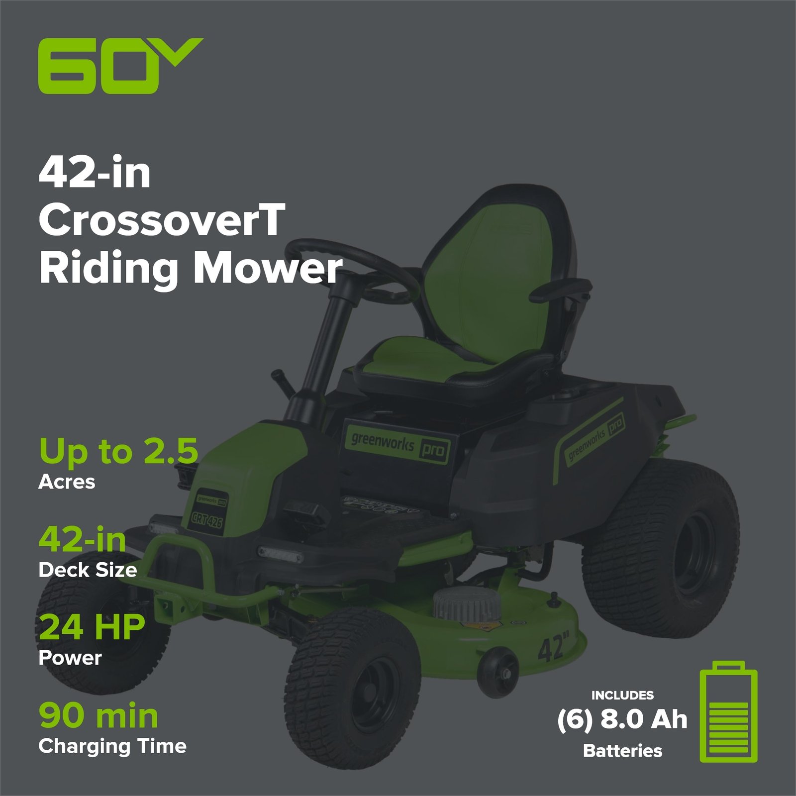 Tags: 60V Brand Campaign, 60V Lawn Mowers, 60V Riding Mowers, Active Lawn Vehicles, Active Products, All Active Products, Back to School, Deals 60V Riding Mowers, Deck Size: 42, Earth Day, Exclusions Apply, Gifts Over $250, Greenworks, June Top Picks, May Picks, Memorial Day, Memorial Day Savings, Mother's Day, Mowers Over $1000, no-deliverydate, no-freeship, no-ship-bar, non-refundable, Over $100, Over 500, Power User, Recommendation, Ryder, Savings Event, smart-cart-shipping-excluded, SPD Savings Event, spo-default, spo-disabled, spo-notify-me-disabled, Spring Savings Event, Tool Type: Lawn Tractors, Tool Type:Lawn Vehicles, variant structure, Voltage:60 Volt